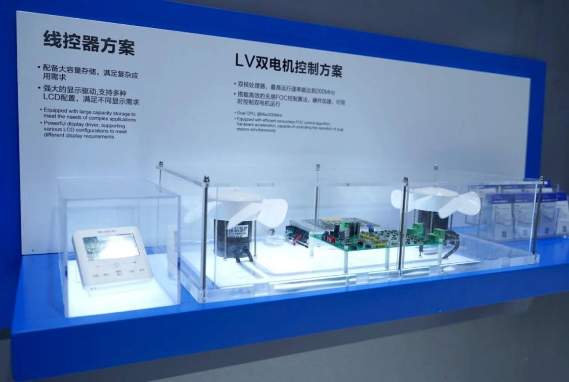 此次展出EM32系列MCU包括電機類、通用型工業互聯類、通用型工控類及低功耗類四大類。同時搭配展出空調外機控制系統、空調柜機控制系統、線控器及LV雙電機控制四款方案。
