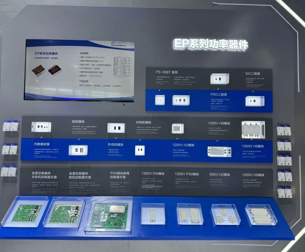 EP系列功率器件及方案在此次展會上吸引了眾多專業觀眾的關注,涵蓋分立器件、IPM智能功率模塊、IGBT 模組和SiC MOSFET模組等多種產品。并同時展出全套功率器件分體機控制器方案、全套功率器件柜機控制器方案及PIM模塊商用控制器方案。