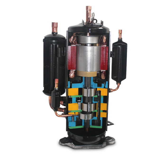 三缸雙級變?nèi)莘e比壓縮機可實現(xiàn)兩 種不同容積比的雙級壓縮,可降低單個氣缸的壓縮比,減小了 泄漏量,提高了壓縮機的容積效率,與單級壓縮系統(tǒng)相比,雙 級增焓壓縮系統(tǒng)具有能力高、能效高和可靠性高的優(yōu)勢,使用 在家用熱泵空調(diào)、多聯(lián)式熱泵空調(diào)、戶用冷水熱泵機組等多種 類型的熱泵產(chǎn)品中。
