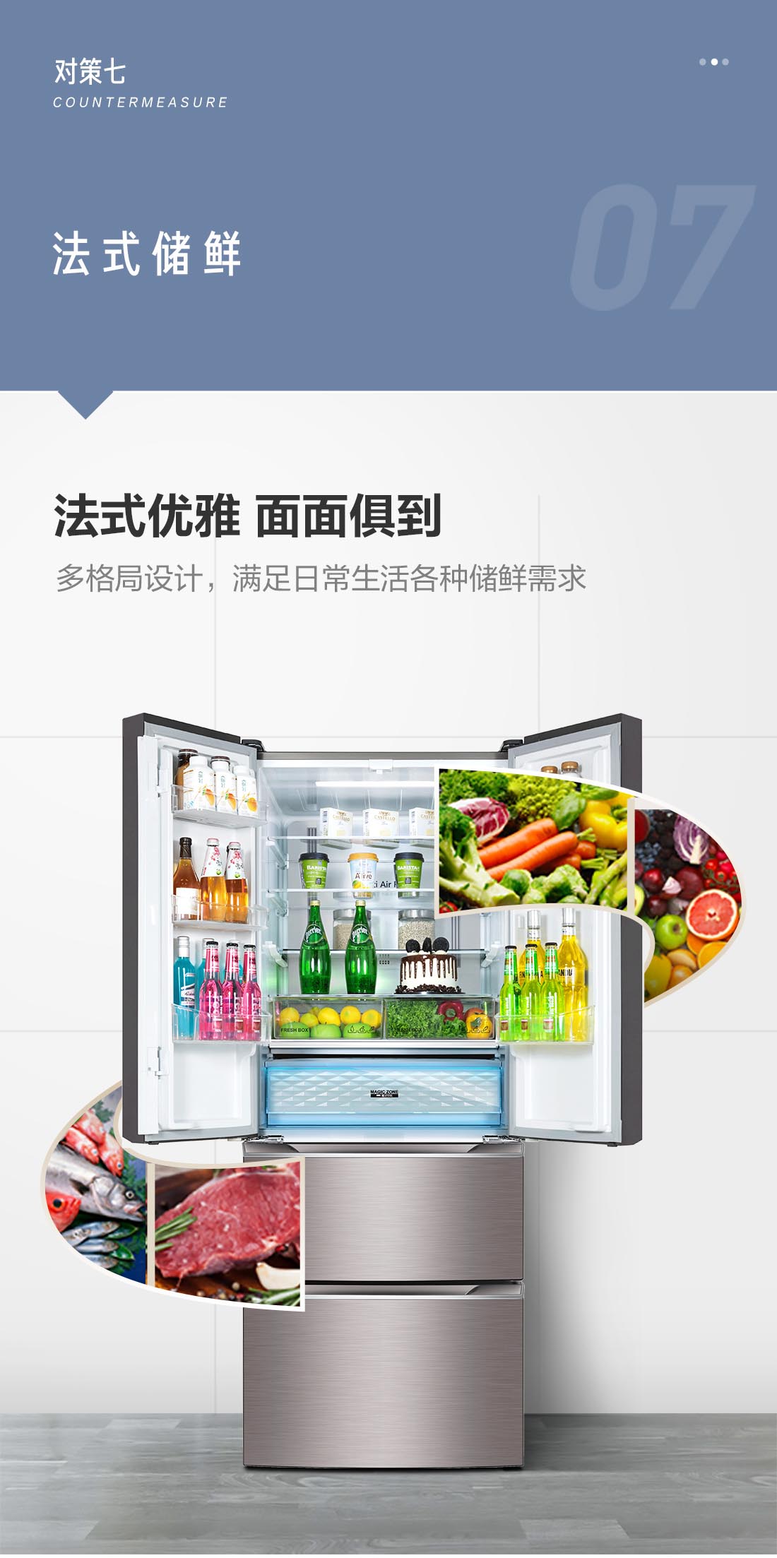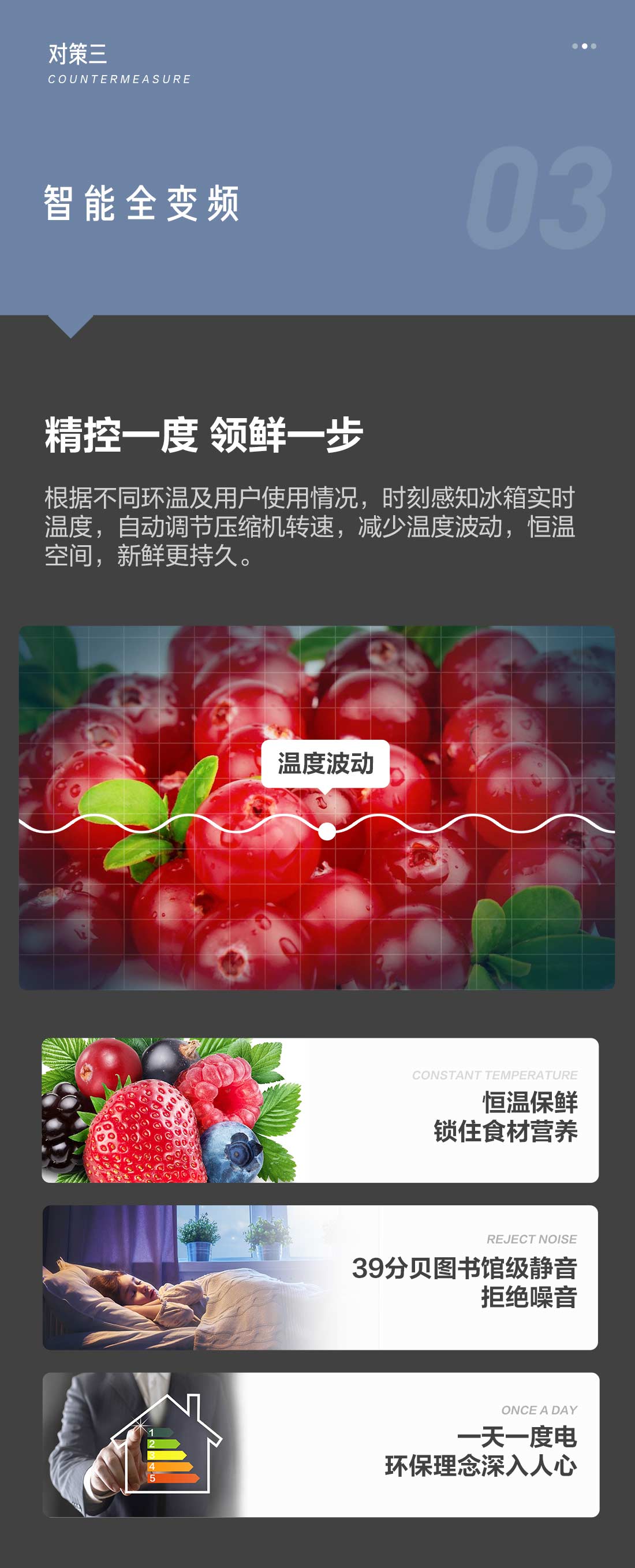 搭載-5℃瞬凍黑科技,鮮嫩兩星期,輕松一刀切。細(xì)胞級(jí)養(yǎng)鮮,營養(yǎng)流失少。搭載-3℃嫩凍黑科技,食材不結(jié)冰,鮮嫩一整周。智能全變頻技術(shù),恒溫保鮮,節(jié)能靜音。