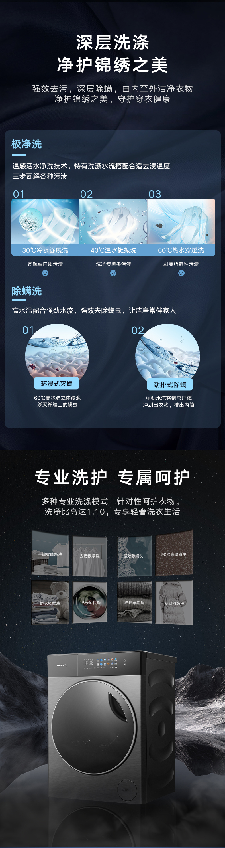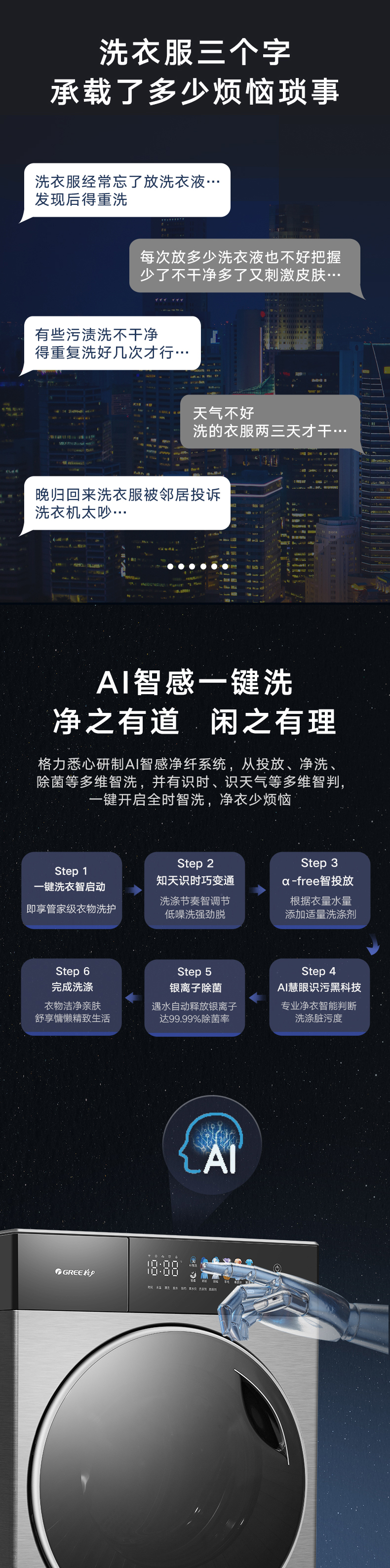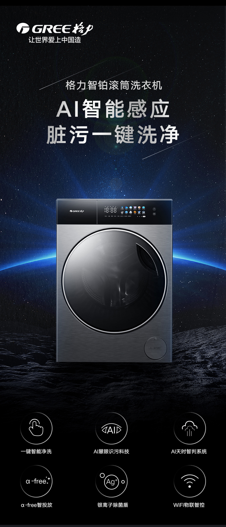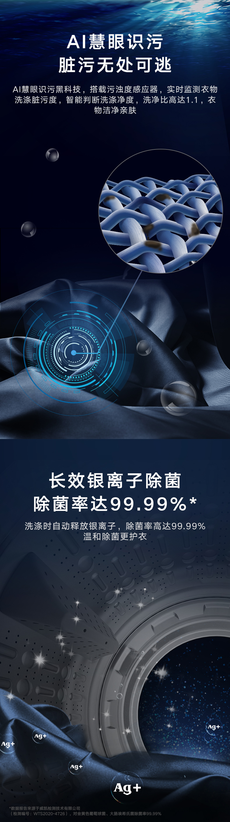 AI智能感應(yīng),臟污一鍵洗凈。AI慧眼識污,智能判斷洗滌凈度,洗凈比高達(dá)1.1